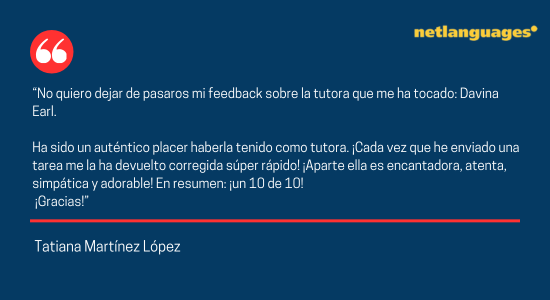 A todos los estudiantes de nuestros cursos tutorizados se les asigna un tutor personal de Net Languages que les ayuda y corrige a lo largo del curso. Los estudiantes pueden dirigirse a su tutor para preguntar cuestiones relacionadas con el curso, practicar la pronunciación, organizar prácticas de conversación en tiempo real y recibir correcciones y comentarios de sus tareas escritas.